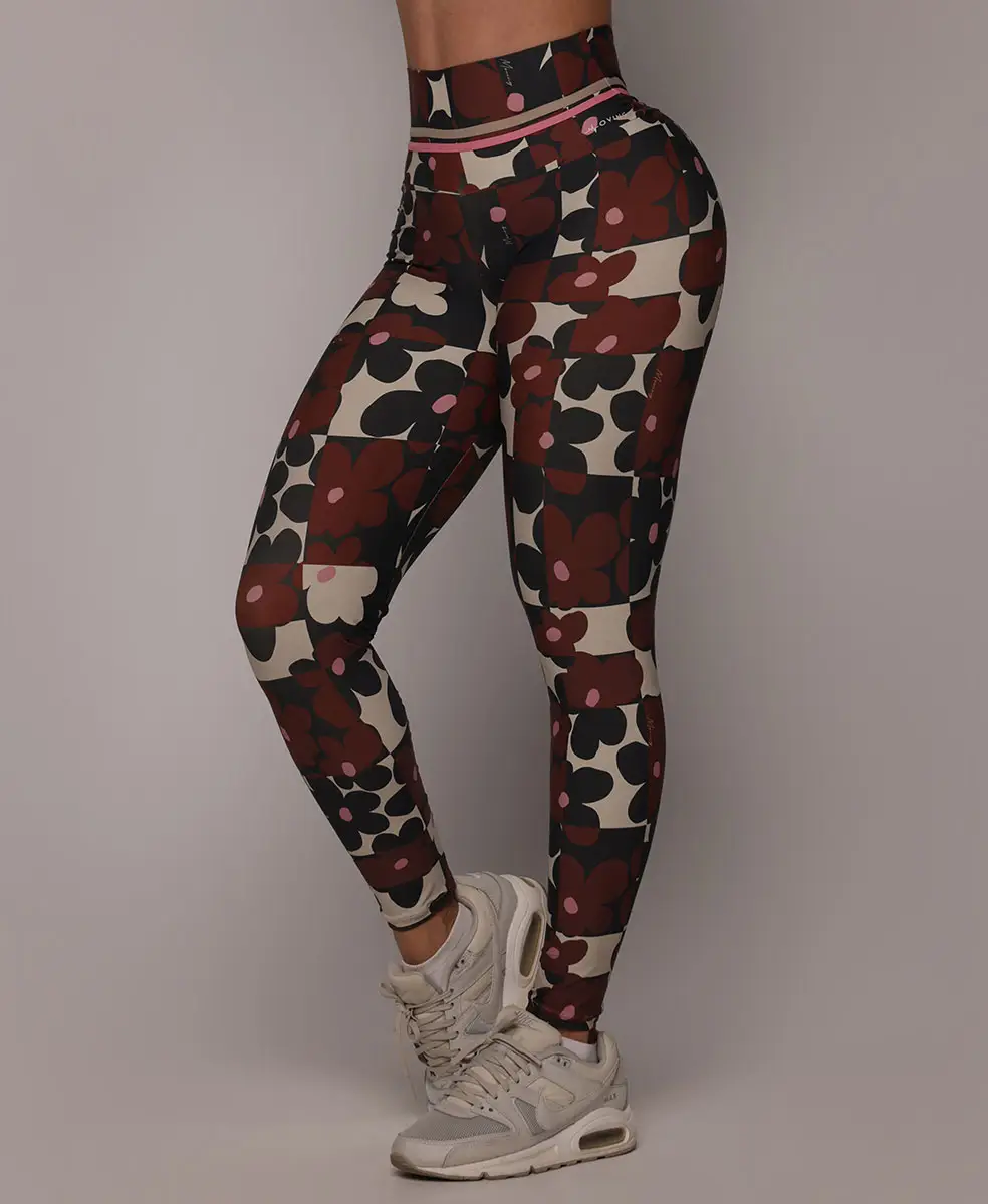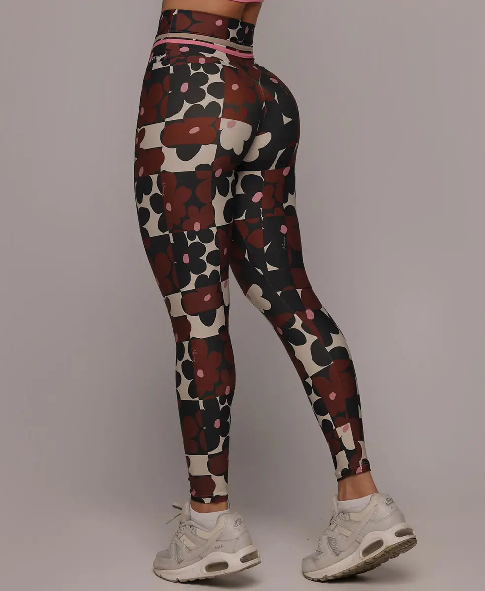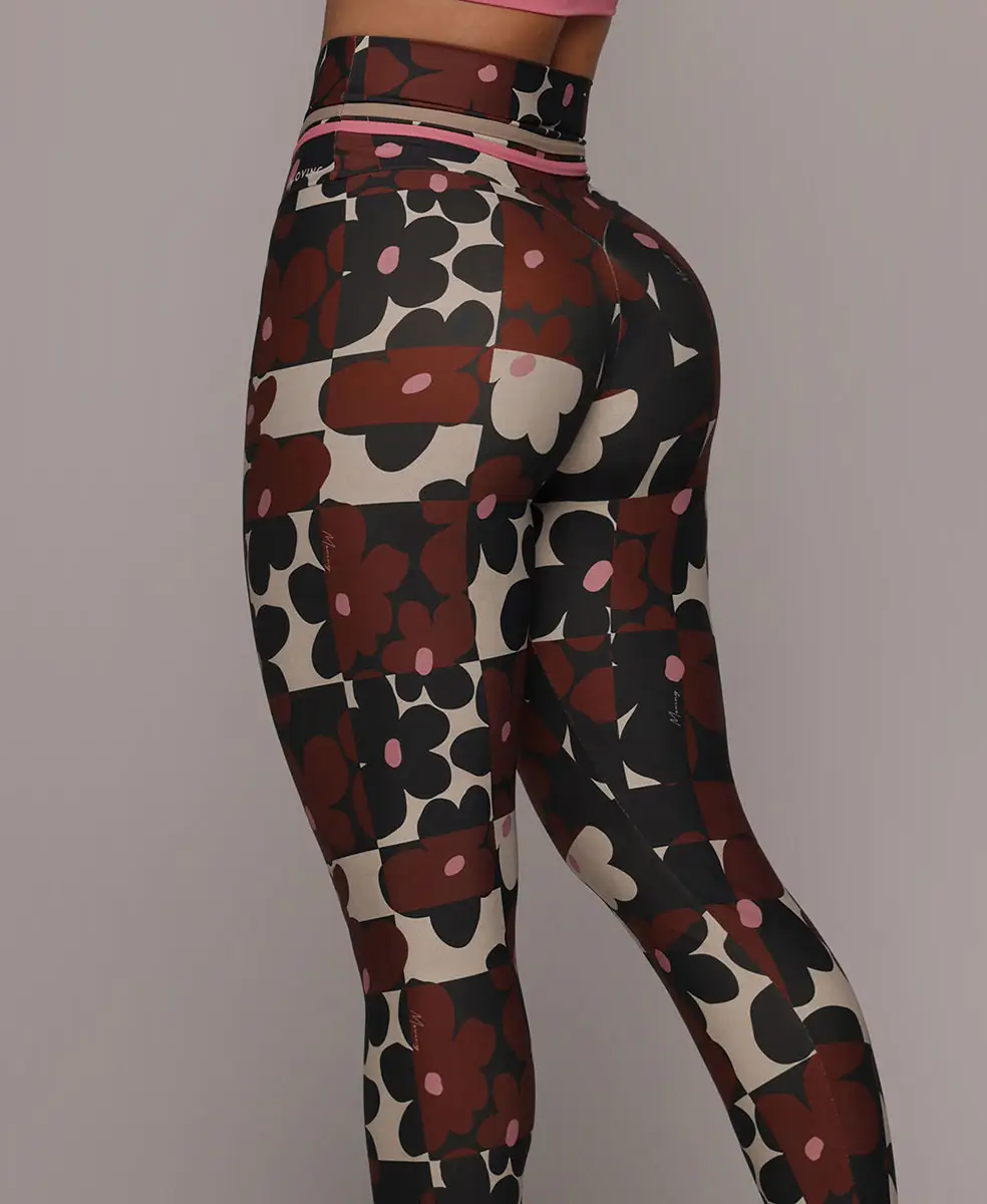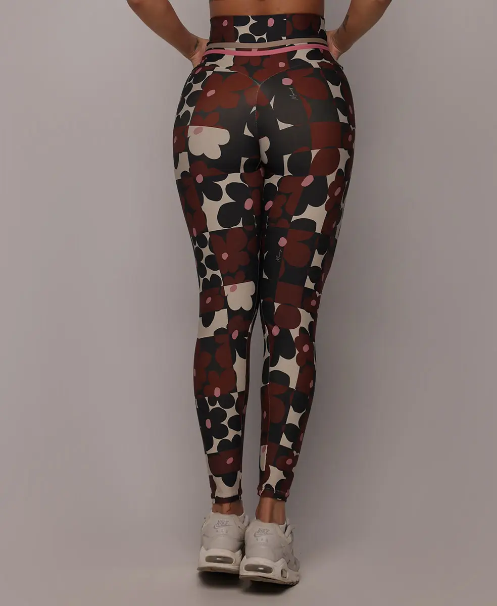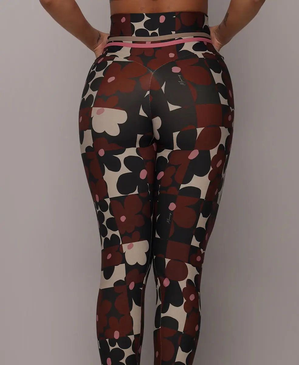 A estampa Bloom traz um floral gráfico contemporâneo, com flores estilizadas em tons terrosos profundos, contrastando com fundo claro e detalhes em rosa suave. O desenho tem ritmo moderno e sofisticado, criando um visual marcante, elegante e atemporal, que valoriza o corpo com personalidade e força feminina.