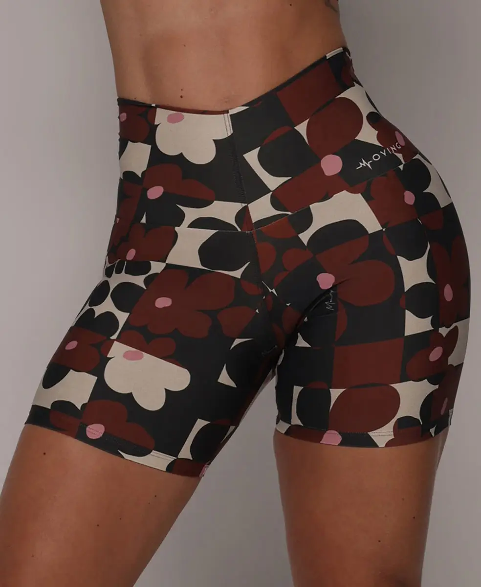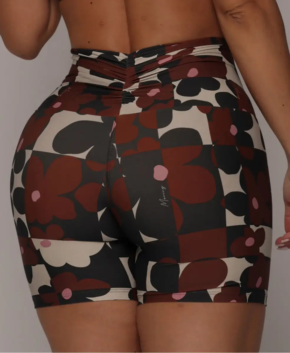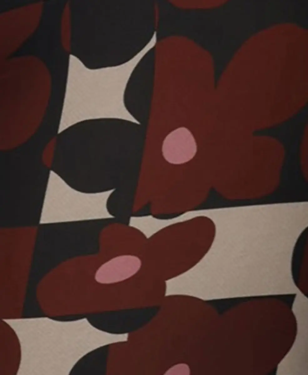 A estampa Bloom traz um floral gráfico contemporâneo, com flores estilizadas em tons terrosos profundos, contrastando com fundo claro e detalhes em rosa suave. O desenho tem ritmo moderno e sofisticado, criando um visual marcante, elegante e atemporal, que valoriza o corpo com personalidade e força feminina.